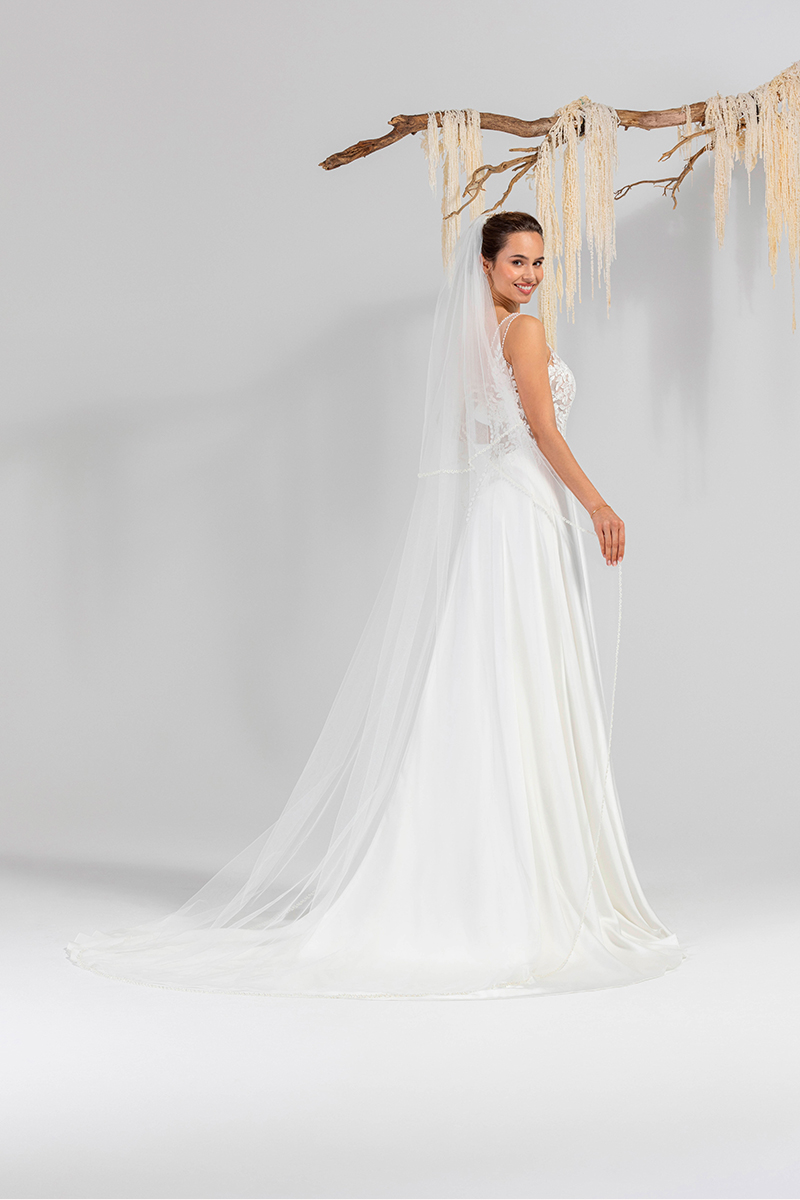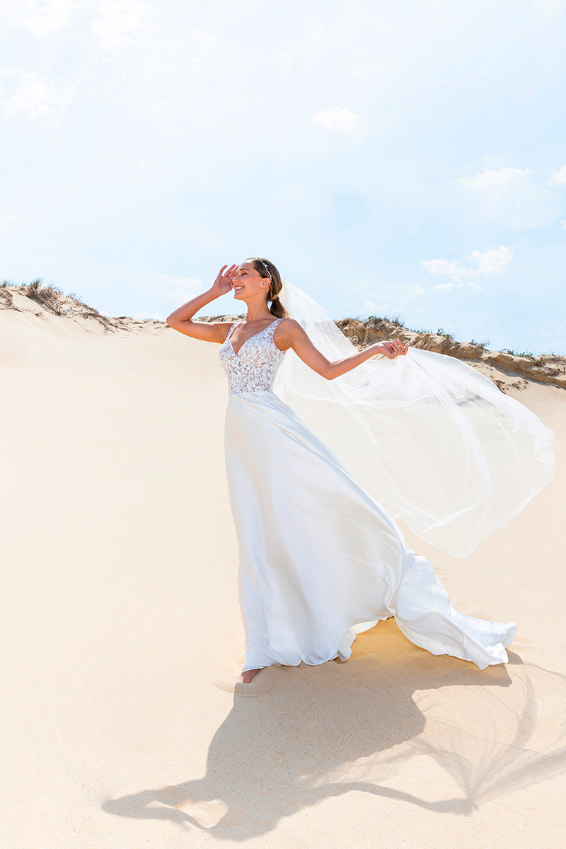 Robe de mariée fluide , bustier dentelle avec fine bretelle
