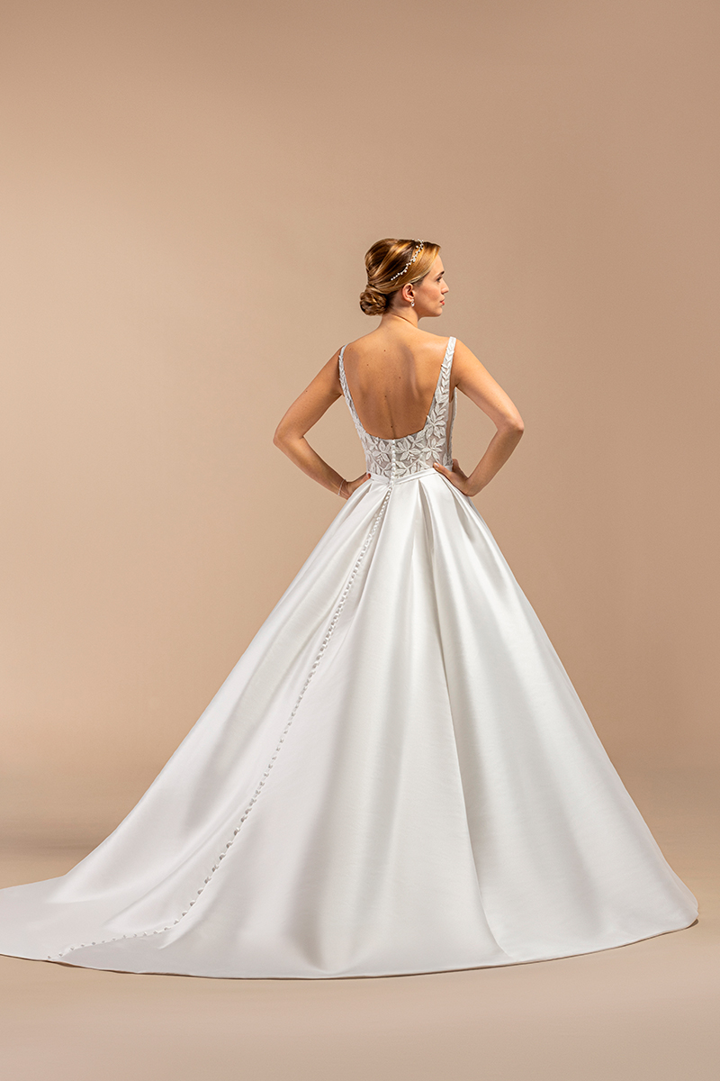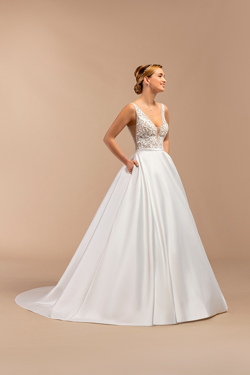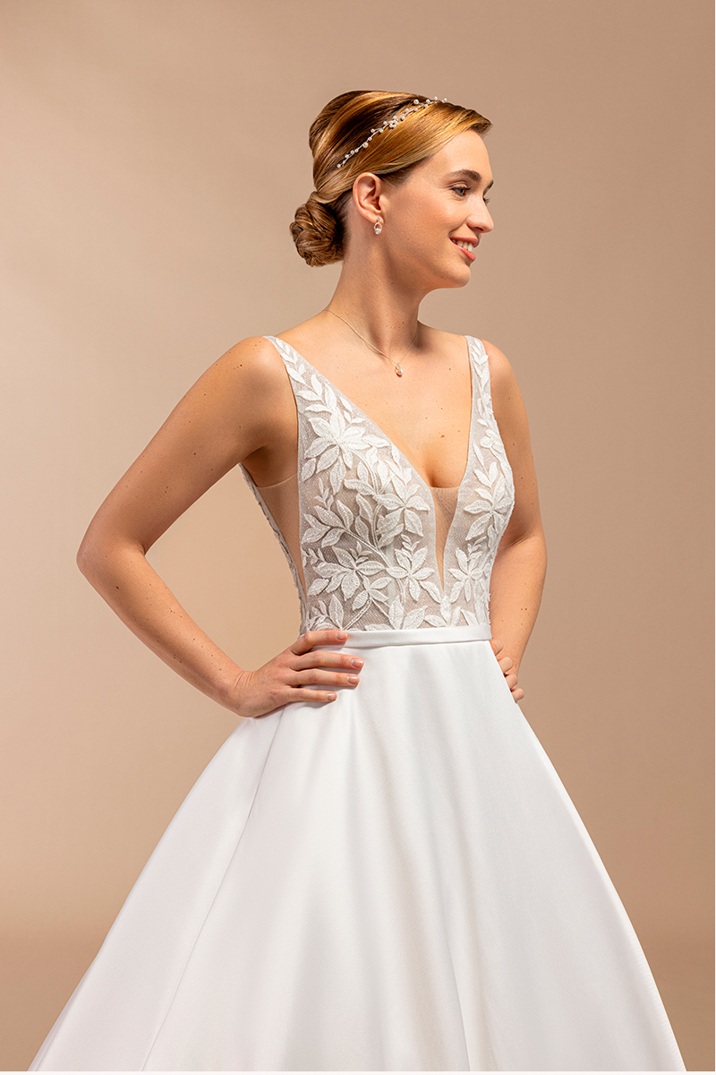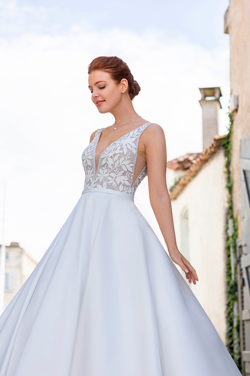Robe de mariée romantique bustier tulle avec application de dentelle et jupe ample en satin
