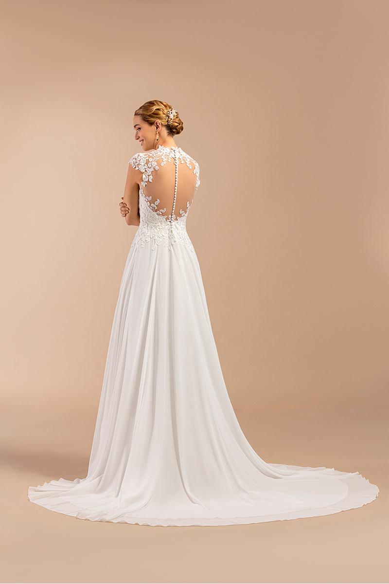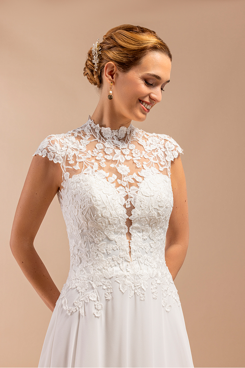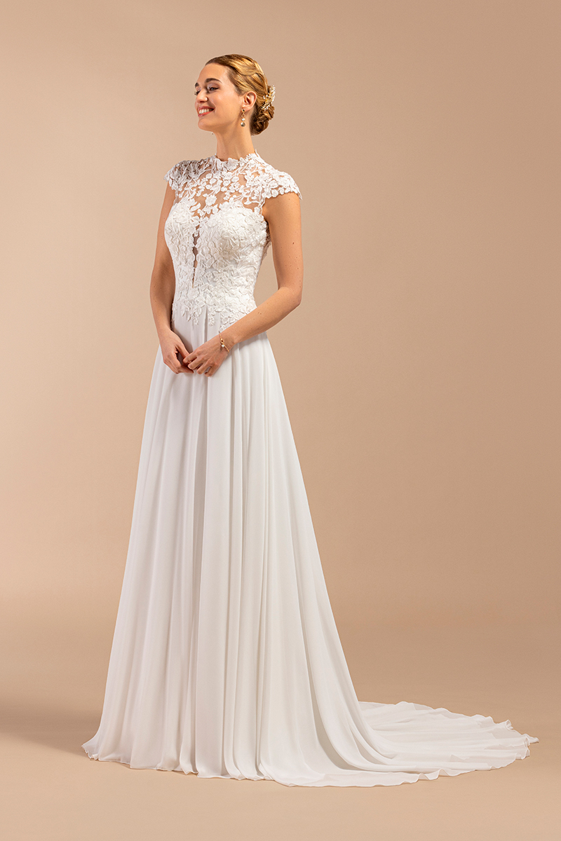 Robe de mariée romantique et bohème , jupe fluide et bustier au décolleté profond qui se couvre de dentelle disponible de la taille 34 a la taille 74