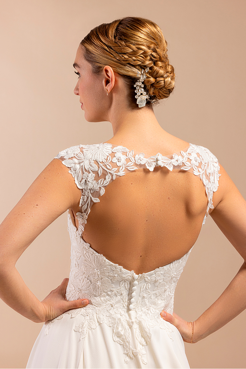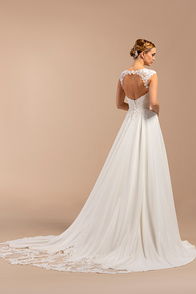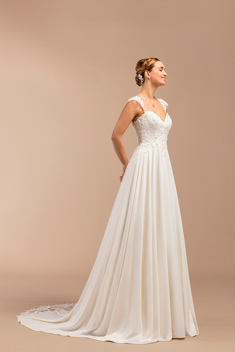 Robe de mariée fluide en crêpe, dentelle et perles au tombé parfait, le décolleté Quenn Anne apporte élégance et confort , disponible de la taille 34 à la taille 701299