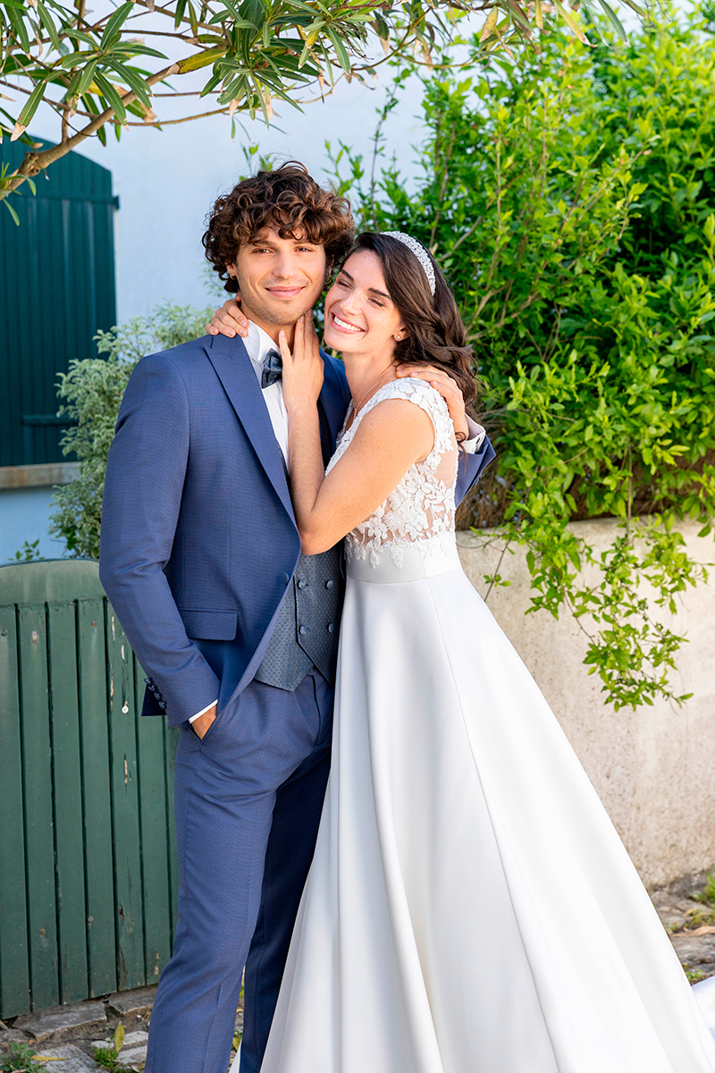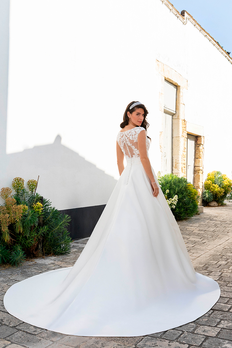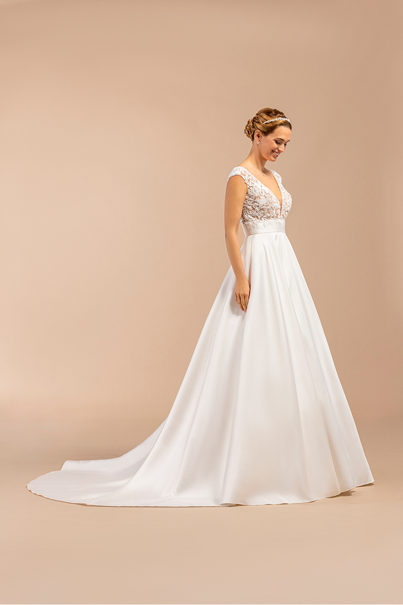 Magnifique robe de mariée forme trapèze en mikado qui structure la taille et le buste avec joli décolleté profond , des applications de dentelle perles et sequins rehaussent cette robe epurée