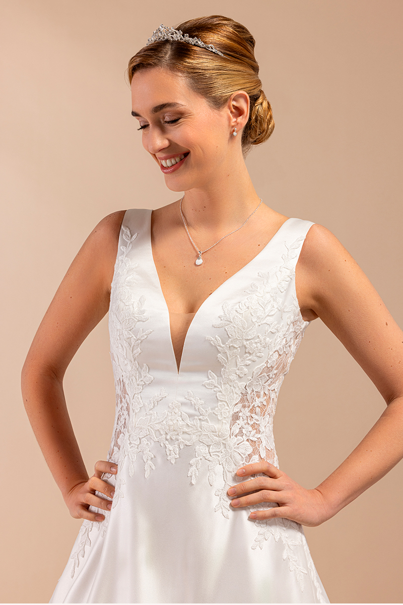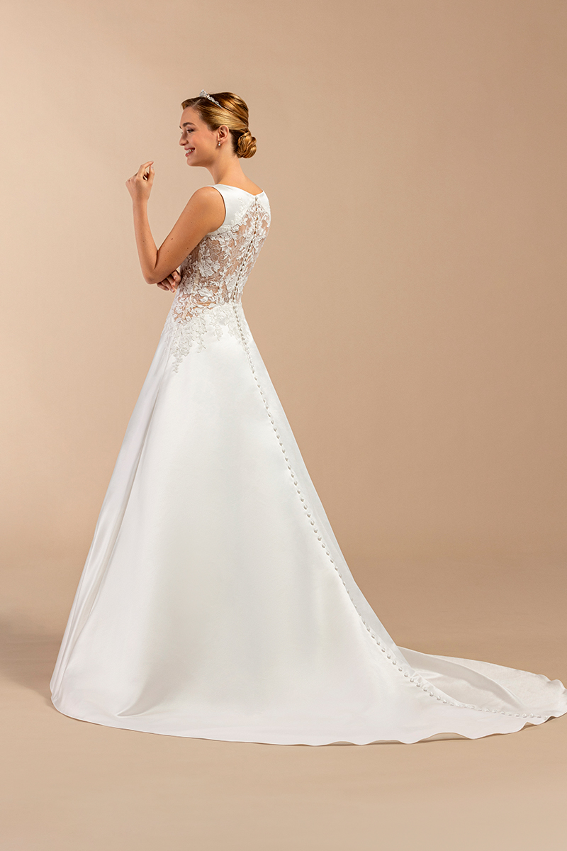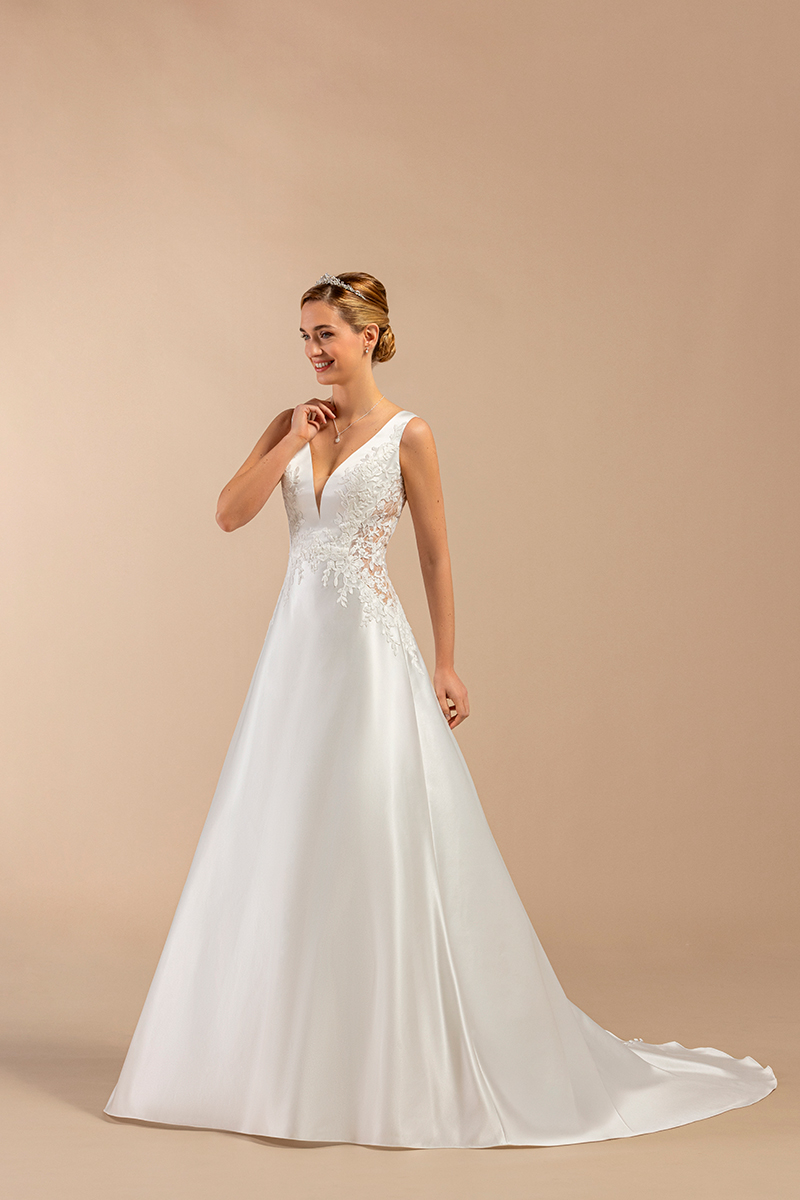 Robe de mariée romantique épurée en forme trapèze , la jupe est en satin ,, amour de dentelle sur les cotés