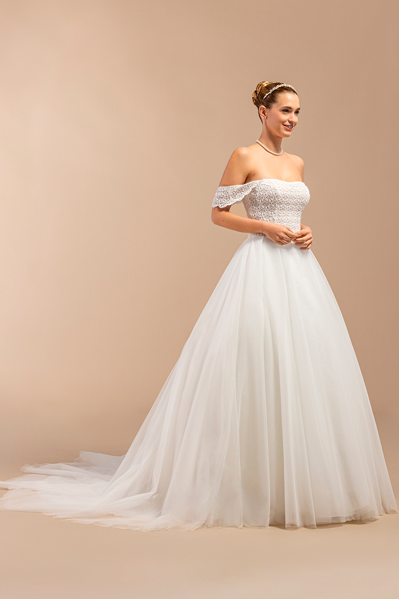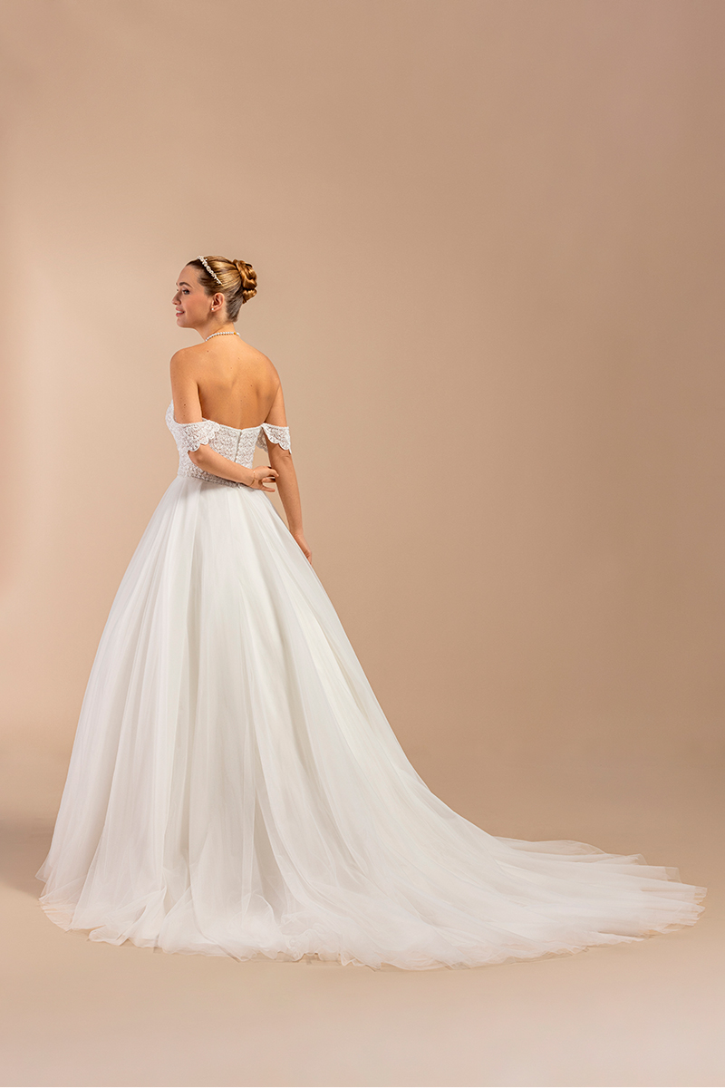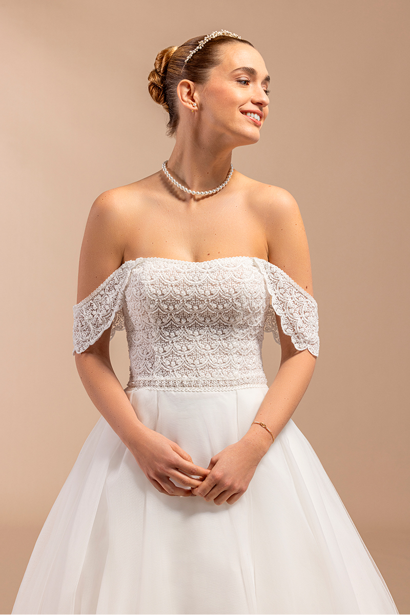 Robe romantique , libre , chic, bustier carré en guipure perlée , et jupe en tulle