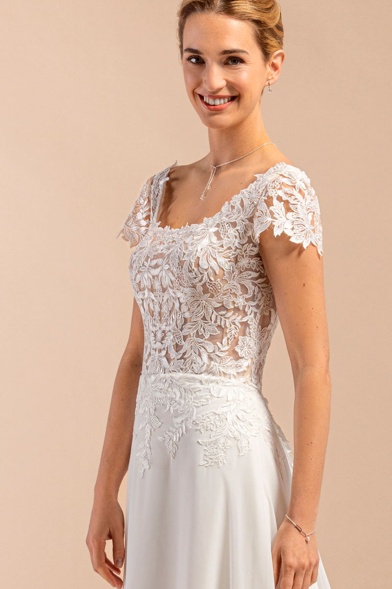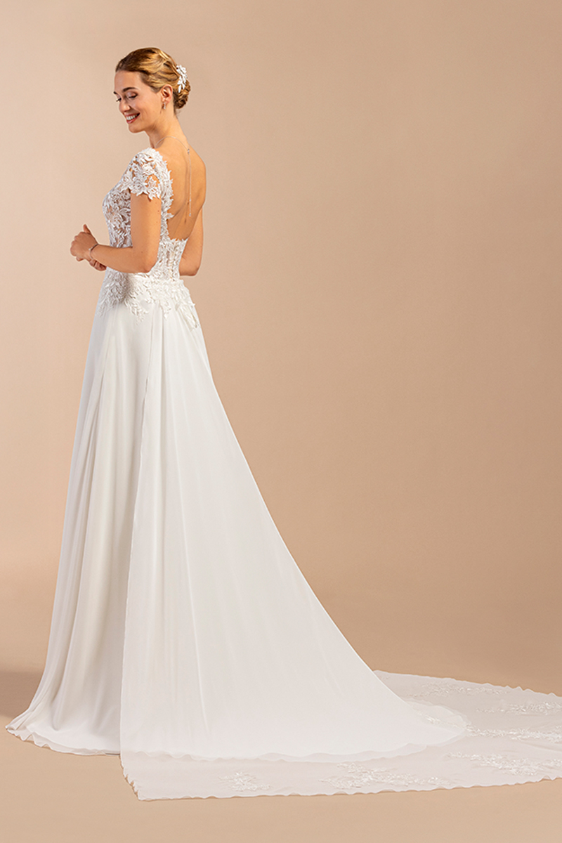 Robe de mariée ultra féminine toute en fluidité avec une traine amovible un haut carré et un superbe dos nu