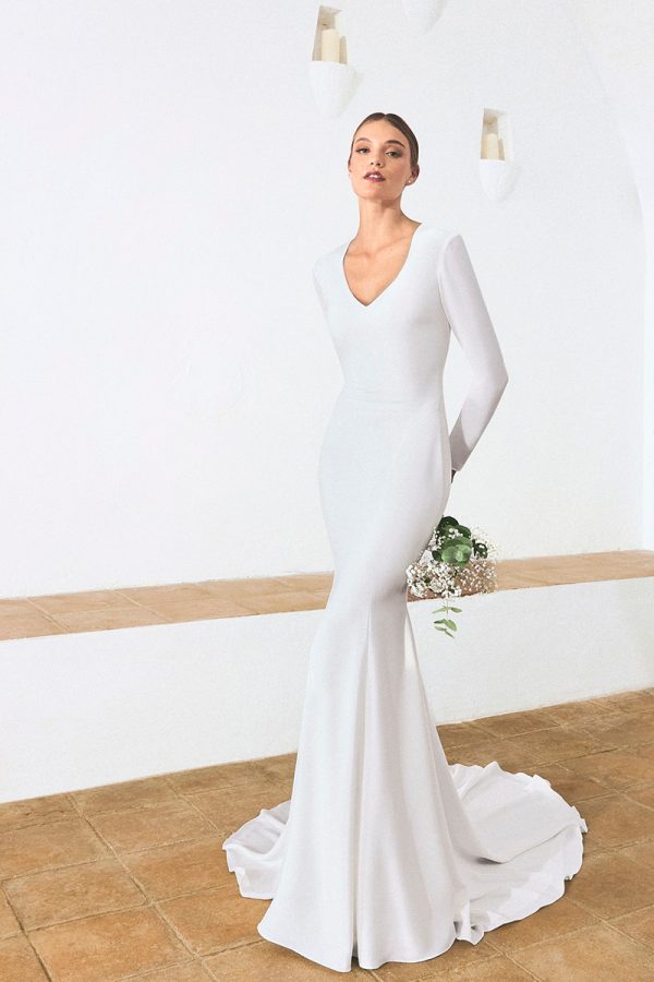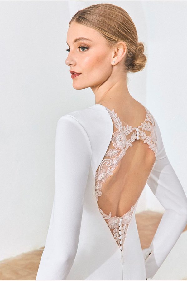 Robe de mariée forme sirène a manches longues, avec dos semi ouvert et rehaussé de dentelles