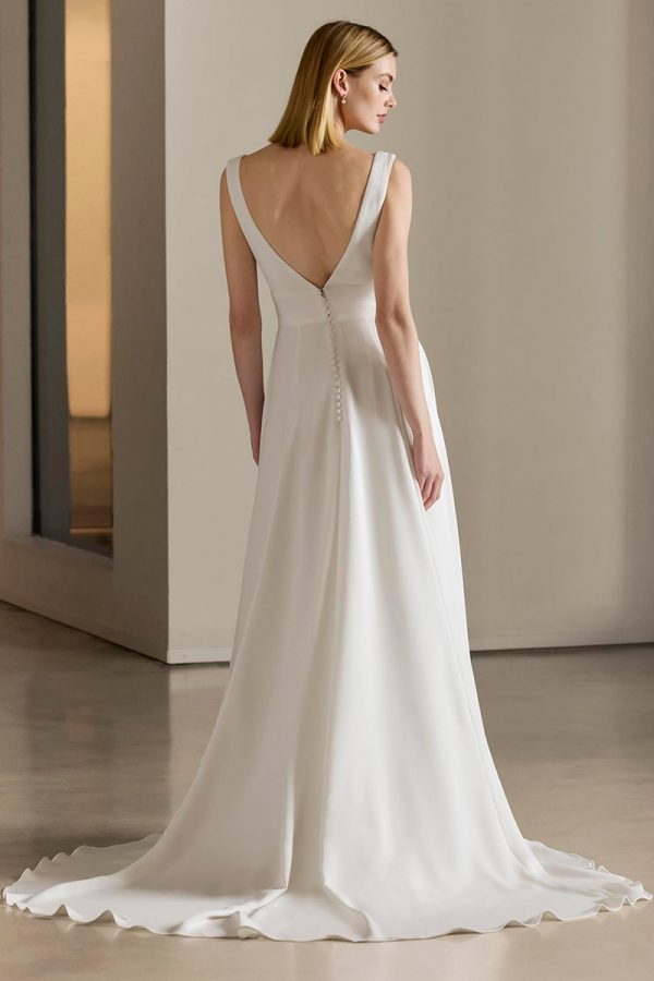 Robe de mariée forme droite en fluide en crêpe gala, taille marquée par une large basque, et jupe légèrement fendue