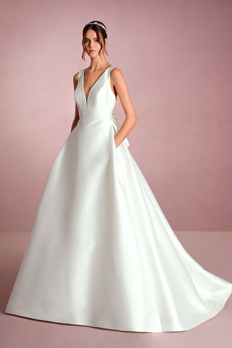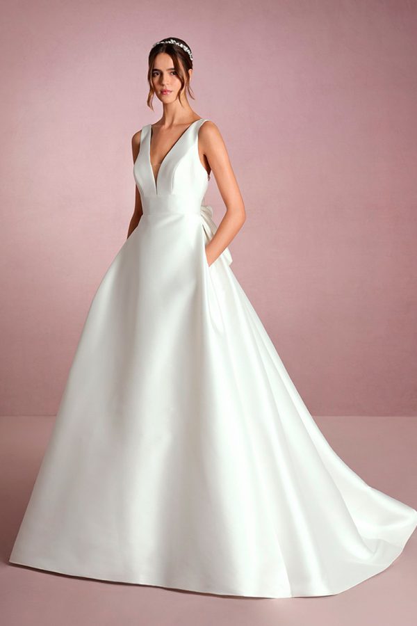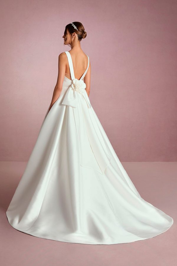 Très belle robe de mariée en mikado de style romantique et sobre, large ceinture pour bien marquer la taille, décolleté en V et jolie dos ouvert