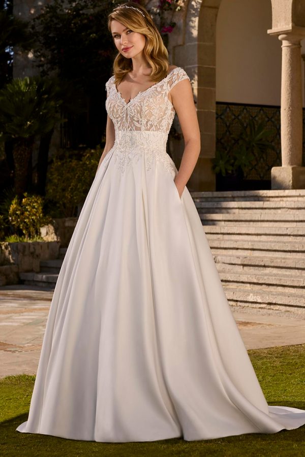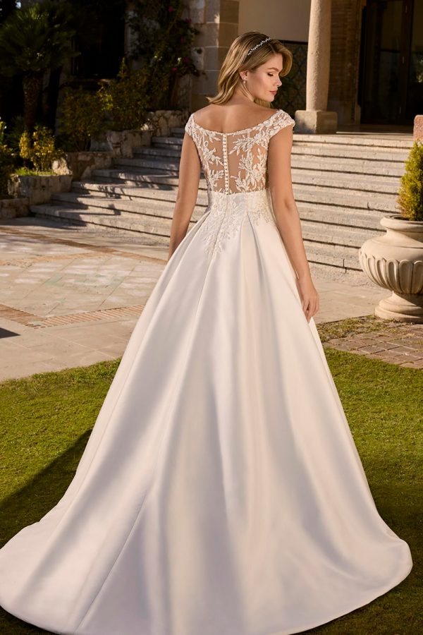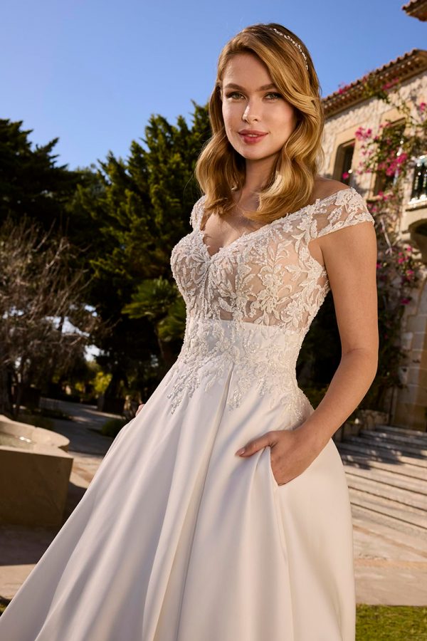 Robe de mariée romantique en mikado souple tulle dentelle et pierreries, encolure large, et légèrement recouvrant le début des bras