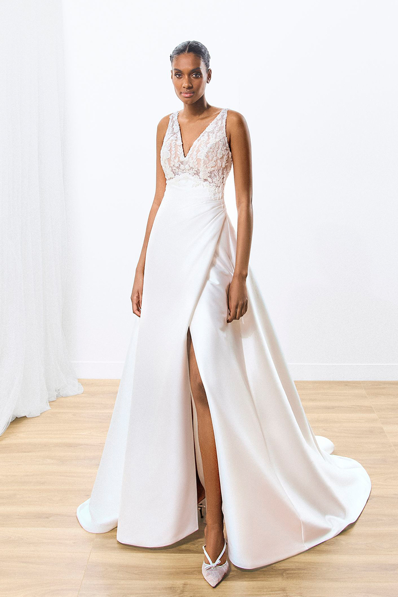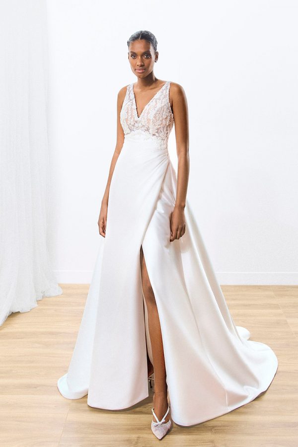 Robe droite et romantique , taille haute sous poitrine et jupe fendue