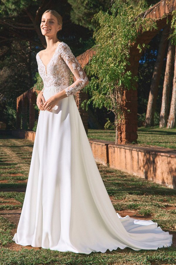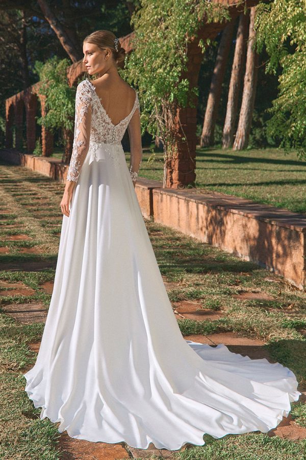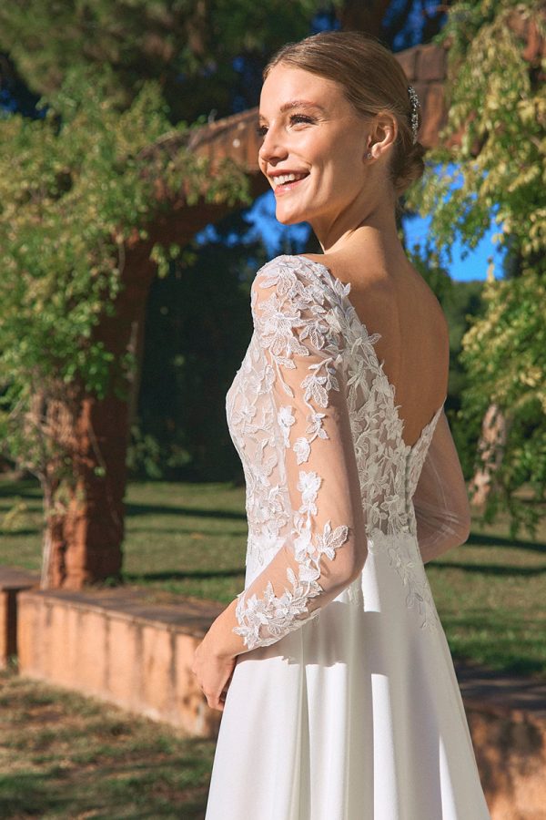 Robe de mariée droite, manches longues , fluide et vintage.