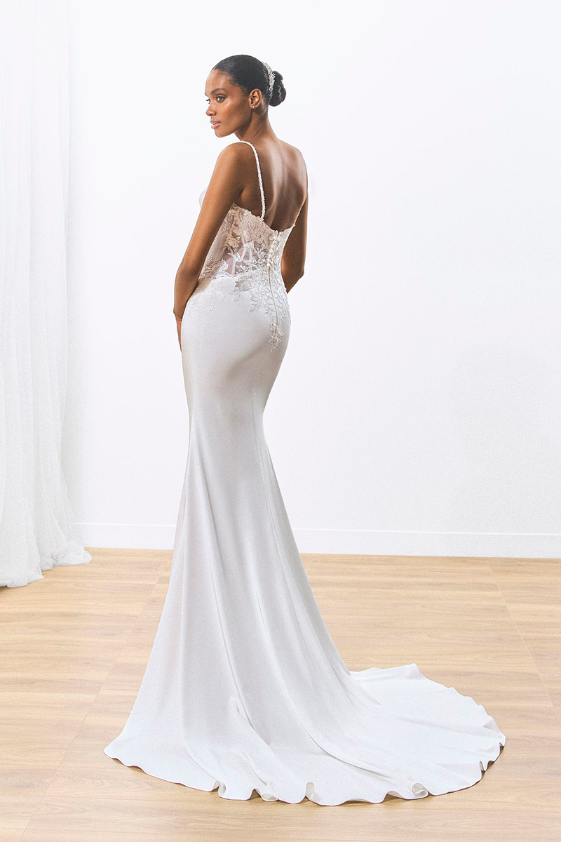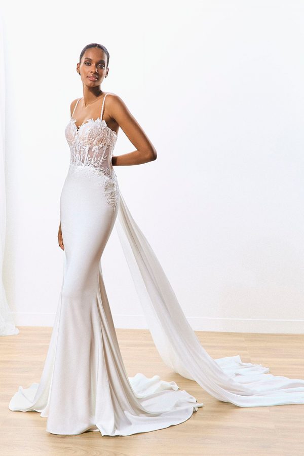 Robe de mariée sirène en tulle paillette et dentelles, bustier baleiné et petites et fines bretelles